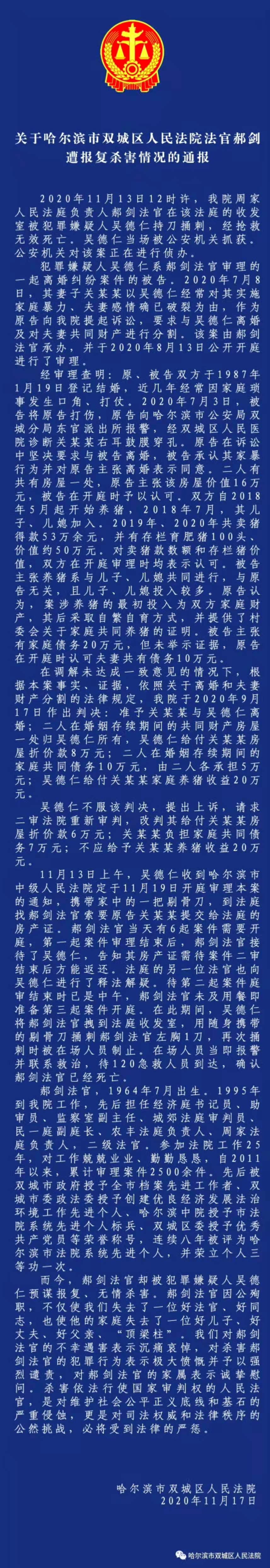 據哈爾濱市雙城區人民法院微信公號消息,2020年11月13日12時許,我院周家人民法庭負責人郝劍法官在該法庭的收發室被犯罪嫌疑人吳德仁持刀捅刺,經搶救無效死亡。吳德仁當場被公安機關抓獲。公安機關對該案正在進行偵辦。犯罪嫌疑人吳德仁系郝劍法官審理的一起離婚糾紛案件的被告。2020年7月8日其妻子關某某以吳德仁經常對其實施家庭暴力、夫妻感情確已破裂為由,作為原告向我院提起訴訟,要求與吳德仁離婚及對夫妻共同財產進行分割。該案由郝劍法官承辦,並於2020年8月13日公開開庭進行了審理。