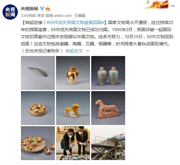 國家文物局今日通報,中國政府經過持續25年的跨國文物追索行動,68件流失英國文物已成功歸國。