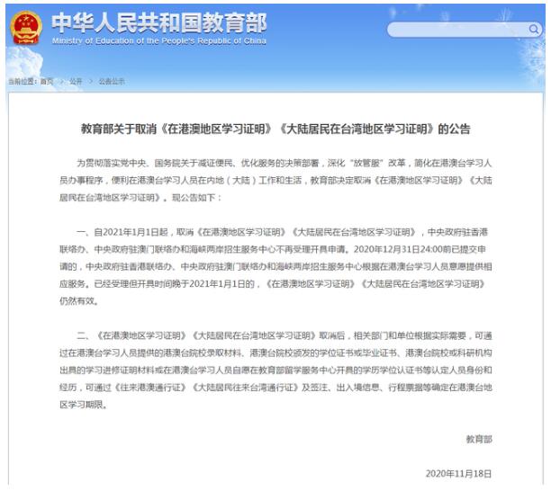 教育部表示,為貫徹落實黨中央、國務院關於減證便民、優化服務的決策部署,深化「放管服」改革,簡化在港澳台學生的辦事程序,便利在港澳台學習人員在內地的工作和生活,決定取消《在港澳地區學習證明》及《大陸居民在台灣地區學習證明》。