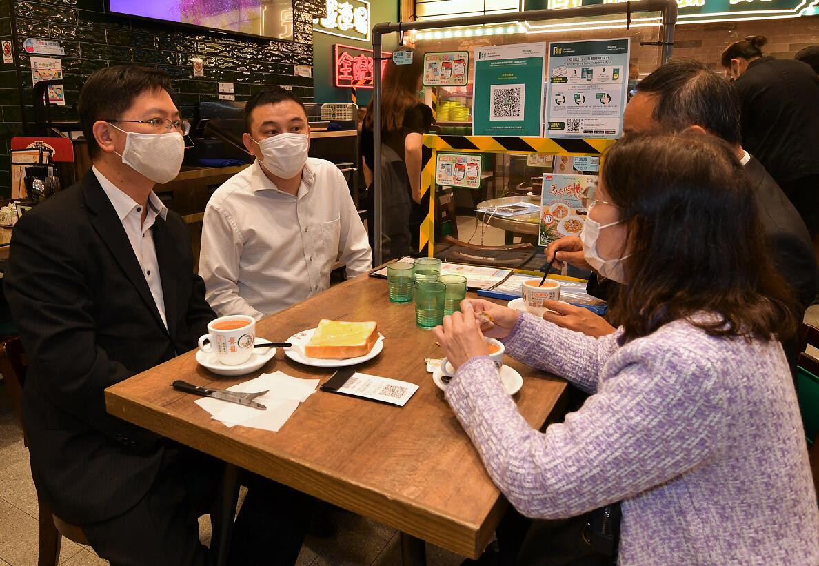 創新及科技局局長薛永恒(左一)在九龍城區一間茶餐廳視察「安心出行」流動應用程式的使用情況,並與茶餐廳店主傾談。旁為食環署副署長黃淑嫻(右一)