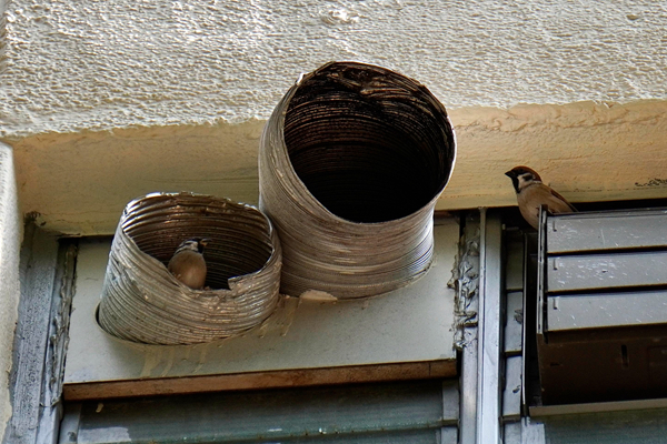麻雀喜在公屋排氣喉棲息(上圖),但有住戶裝網阻止(下圖)。