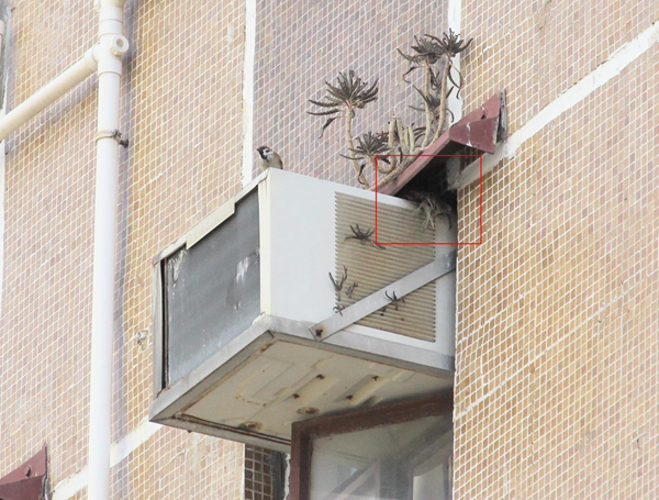 麻雀在冷氣機頂狹隙築巢(紅框示)。