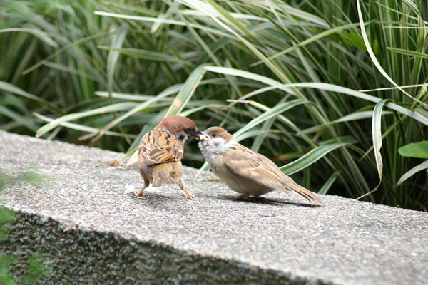 麻雀幼鳥嘴基呈淡黃色。圖為成鳥餵哺幼鳥。王學思提供圖片