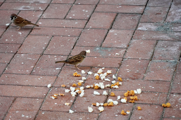 麻雀如人類,早上睡醒後,就出來找東西吃。牠的天性是吃天然環境裏草的種子,所以從前鄉郊稻田會有很多麻雀。時移勢易,種稻早已式微,很多麻雀愛在有植被的住宅區流連,因為那裏人口多,食物多,樹木又可讓牠遮蔭、躲藏。在乙明辦事處旁的休憩通道,有中年男士在拋麵包碎,十多隻麻雀即從通道外的大樹飛下來覓食,當有人經過通道時,又飛回樹上躲藏,這樣不停上上落落只為填飽肚子。彭說,人為活動可影響麻雀聚集,將牠們變成打躉陀地,垃圾房有很多殘渣剩菜,一些屋苑的露台又會人為地放些米、麵包碎,麻雀就在這些地方兜兜轉轉,在沙角邨的街市及垃圾站,果見有麻雀飛過,有些停靠在燈柱上等待好時機,「在中亞歐洲這些外國地方,郊區農田多,麻雀根本不會那麼黐人」。