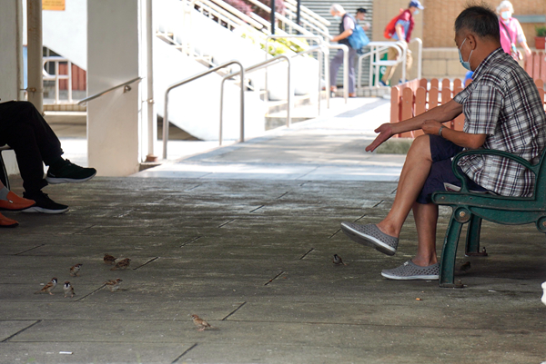 乙明邨公屋休憩通道,中年男士餵麻雀吸引聚集。記者馮俊文攝