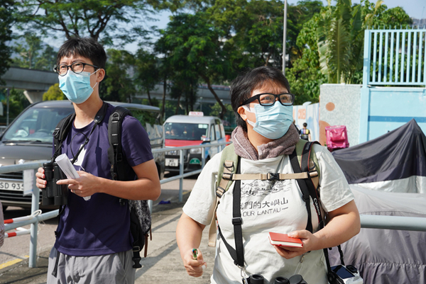 彭俊超(左)及王學思帶備普查裝備如望遠鏡、相機、紙筆,在沙田圍屋邨尋找麻雀的蹤影。
