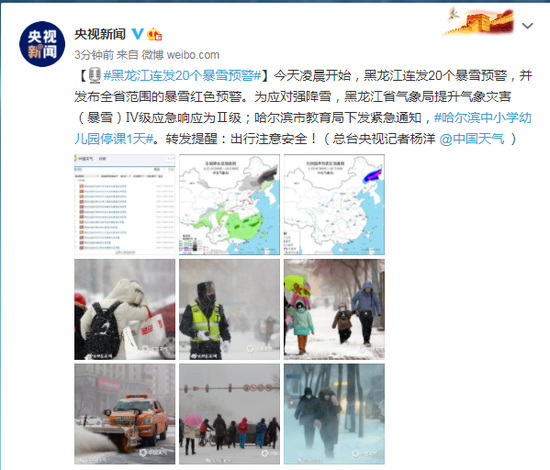 今天凌晨开始,黑龙江连发20个暴雪预警,并发布全省范围的暴雪红色预警。为应对强降雪,黑龙江省气象局提升气象灾害(暴雪)Ⅳ级应急响应为Ⅱ级;哈尔滨市教育局下发紧急通知,哈尔滨中小学幼儿园停课1天。