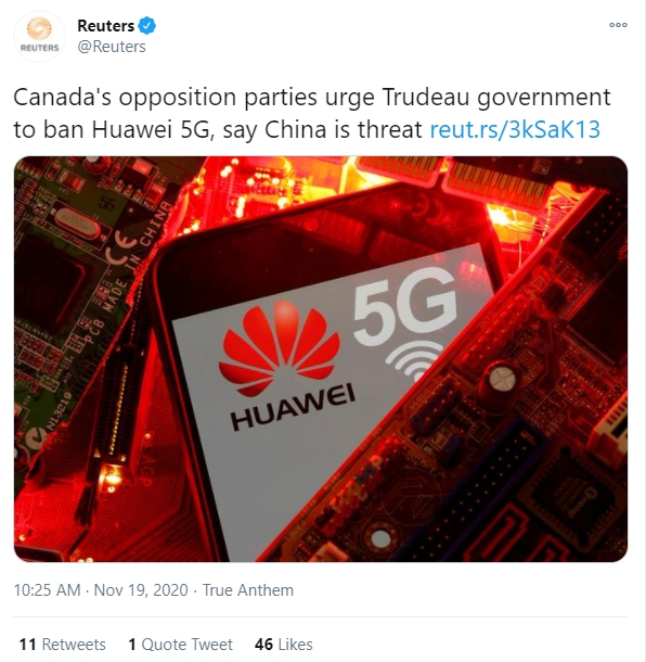 據路透社消息,在保守黨的推動下,加拿大反對黨18日通過了一項針對中國、針對華為的動議,但「不具有約束力」,敦促總理特魯多的自由黨政府對中國更強硬,包括正式禁止華為5G技術。