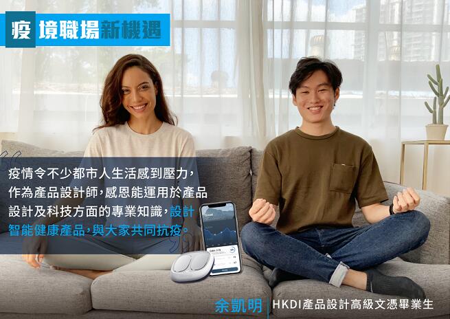 香港知專設計學院產品設計高級文憑畢業生余凱明因目睹港人因新冠肺炎疫情而生活壓力百上加斤,便與數名合夥人創立一家產品設計初創公司,研發智能健康裝置,協助都市人在新冠肺炎疫情下以靜觀方法減壓。