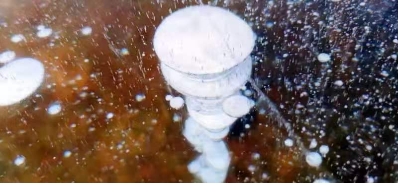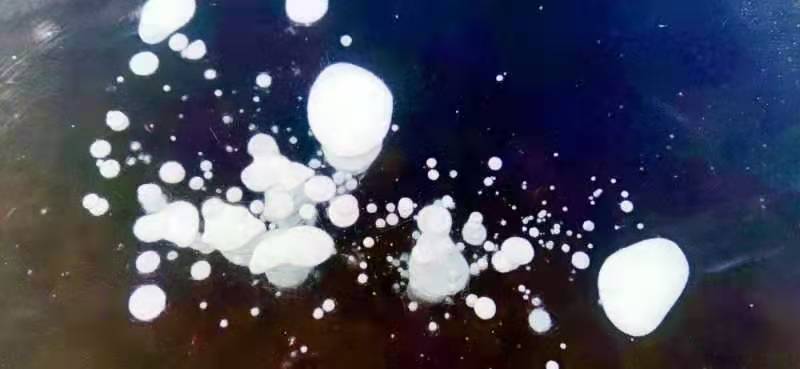 目前,漠河觀音山景區的蓮花湖湖面已完全封凍,冰層最厚的地方已超過60厘米,透過晶瑩剔透的冰面,可以看到一串串潔白的氣泡分布在冰層之中,形成惟妙惟肖的冰泡奇觀。這些冰泡晶瑩剔透、造型奇特,有的形似「飛碟」一飛沖天,有的形似「珊瑚」美輪美奐,形態各異......如一幅幅精美的冰雪藝術畫卷,吸引眾多攝影家和遊客慕名而來,成為漠河冬季火爆的打卡地點。
