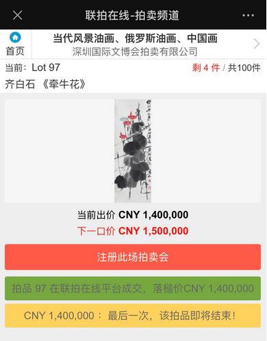 11月16日,第十六屆文博會正式雲上開幕。同期,文博會拍賣公司依託「雲上文博會」平台,通過PC端連結呈現,並同步「雲上文博會」主頁面打造了當代風景油畫、俄羅斯油畫和中國畫三個主題專場,共計100件拍品。在進行為期兩日的線上預展後,19日下午三點,文博會線上拍賣會正式舉槌,對三大主題專場精品佳作進行拍賣、交易。記者發現,俄羅斯油畫和中國畫尤為受歡迎。其中,備受藏家關注的齊白石水墨畫《牽牛花》以1400000元落槌成交。
