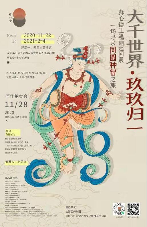 由金活醫藥集團(01110.HK)旗下深圳市舒心堂藝術文化傳播有限公司主辦,總策劃人陳樂燊及策展人趙蔚瑛團隊攜手佛門工筆畫家釋心德法师舉辦的《大千世界·玖玖歸一》釋心德工筆畫巡回展深圳首站即將于2020年11月22日至2021年2月4日開展。