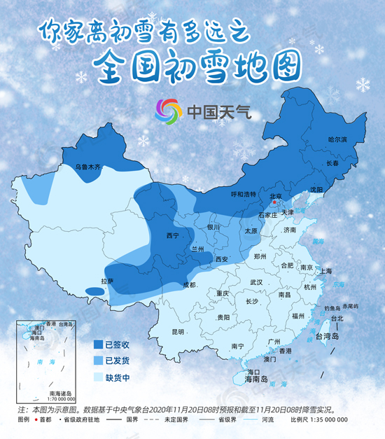 截至11月20日8時,我國新疆北部、青海、內蒙古、黑龍江等多地已經「簽收」了今冬的初雪。隨着冷空氣來襲,寧夏、陝西、山西、北京、天津等地的初雪陸續發貨,今後三天(20-22日)將陸續派送到家,當地小夥伴注意簽收。而南方大部地區,此次冷空氣主要带來的是降雨降溫,雪花暫時缺貨,賞雪還得靜待時日。