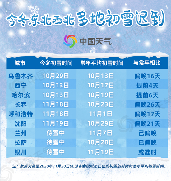 這個冬天,我國不少地方的初雪都遲到了,大城市中,除了哈爾濱和西寧比常年平均初雪時間略有提前外,長春、沈陽、呼和浩特、烏魯木齊等城市都遲到10天以上,其中,長春偏晚26天。而與常年相比,拉薩、蘭州的初雪已經注定遲到。
