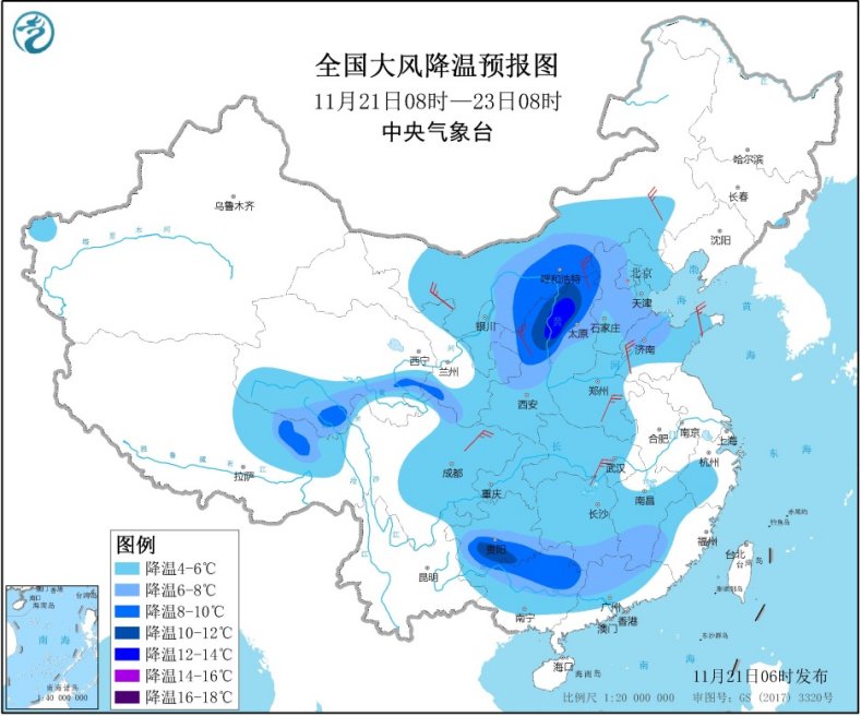 21日至22日,中東部地區仍有大範圍雨雪降溫過程。預計21日08時至23日08時,內蒙古中西部、西北地區東部、華北、黃淮大部、江淮西部、江漢、西南地區東部和北部、江南大部、華南北部等地將出現4-8℃降溫,其中,內蒙古中部、陝西北部、山西北部、貴州中部等地局地降溫幅度可達10℃以上。長江中下游以北地區並伴有4-6級偏北風,陣風7~8級。中央氣象台11月21日06時繼續發布大風降溫預報。