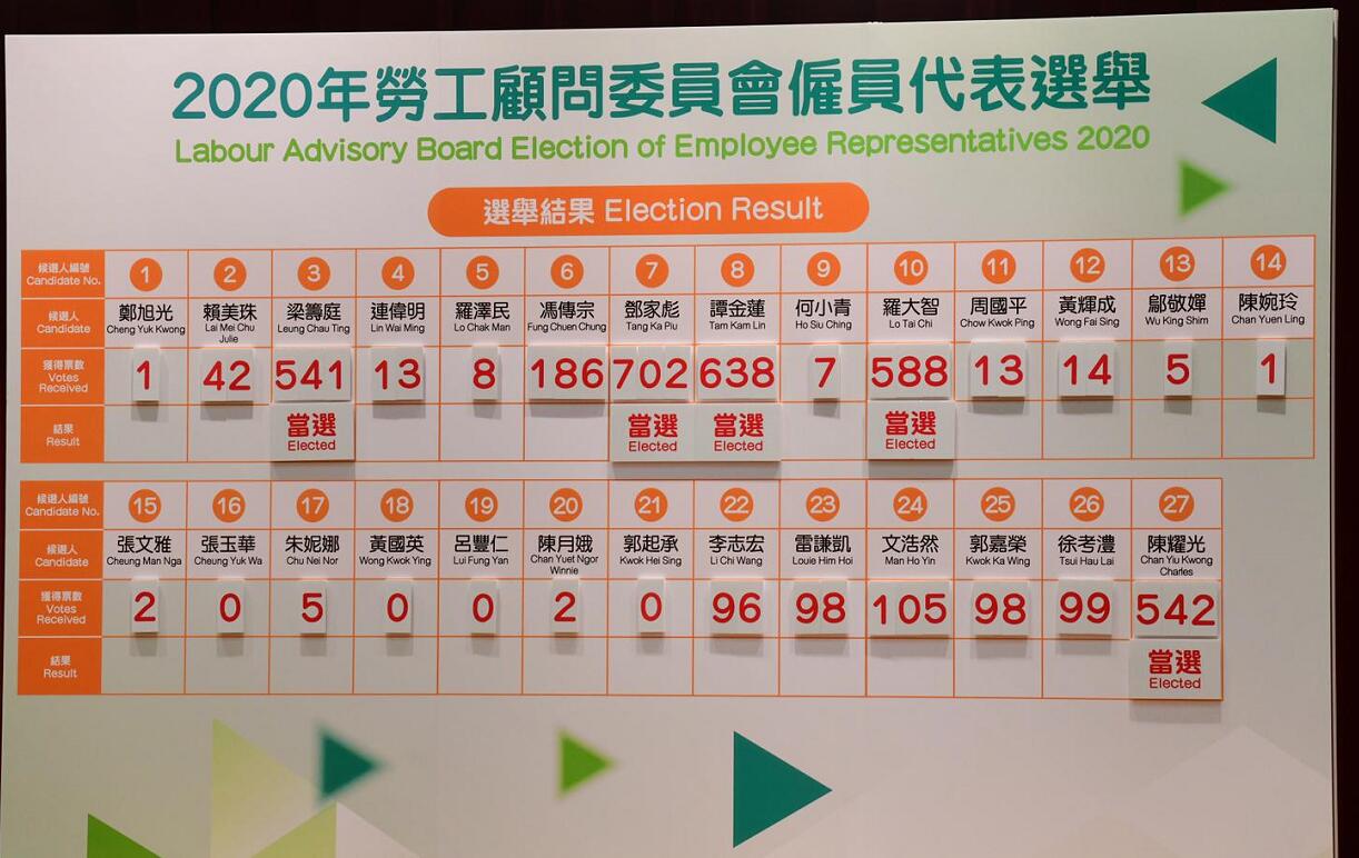 勞顧會是一個諮詢組織,就有關香港勞工事宜,包括香港法例及國際勞工公約的引進適用情況,向勞工處處長給予建議,及監察補充勞工計劃。今次選舉共有847名獲授權代表在選舉中投票,投票率高達97.5%。5名當選的僱員代表將出任下屆勞顧會委員,任期由2021年1月1日起,為期2年。(記者 李銘欣 叶佩如)