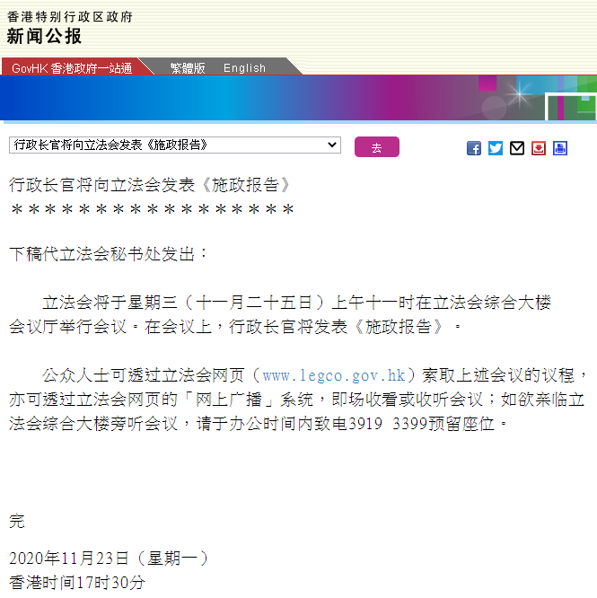 港府23日傍晚發布新聞公報指,立法會將於星期三(11月25日)上午11時在立法會綜合大樓會議廳舉行會議。在會議上,行政長官林鄭月娥將發表《施政報告》。