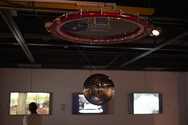 邵志飛教授創作、能夠讓公眾控制球體擺動的金屬球體裝置《The Spatial Pendulum》。