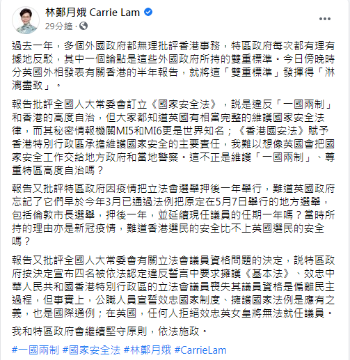 對於英國政府發表所謂「香港問題半年報告」,行政長官林鄭月娥23日晚在社交媒體發文,直斥英方將「雙重標準」發揮得「淋漓盡致」,重申將繼續堅守原則,依法施政。全文如下: