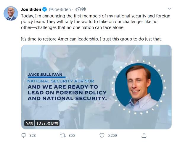 拜登23日在推特上稱,「今天,我宣布了我的國家安全和外交政策團隊的首批成員。他們將團結全世界來應對我們所面臨的這些挑戰——這是任何一個國家都無法單獨應對的挑戰。」拜登说,「是時候恢復美國的領導地位了。我相信這個團隊可以做到。」