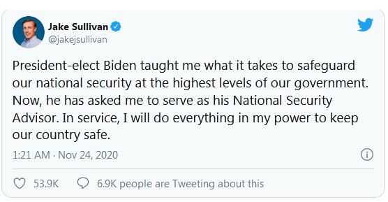 沙利文曾在奧巴馬政府中擔任副總統拜登的國家安全顧問。「『當選總統』拜登教會我如何在政府高層保衛我們的國家安全,現在,他讓我擔任他的國家安全顧問。在任職期間,我將盡我所能保護我們國家的安全。」沙利文23日在推特上寫道。