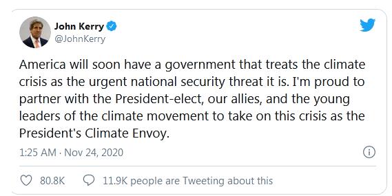 克里曾在2013年至2017年擔任奧巴馬政府國務卿。「美國很快就會有一個將氣候危機視為國家安全威脅的政府,我很榮幸能與當選總統,我們的盟友以及氣候運動的年輕領袖們合作,作為總統氣候特使來應對這場危機。」克里在推特上這樣說。
