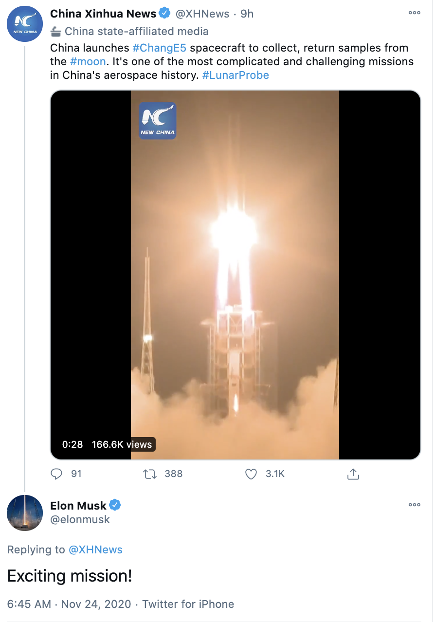 當地時間23日,就新華社嫦娥五號探測器發射成功的新聞報道,特斯拉CEO馬斯克在推特上稱這是令人興奮的任務。