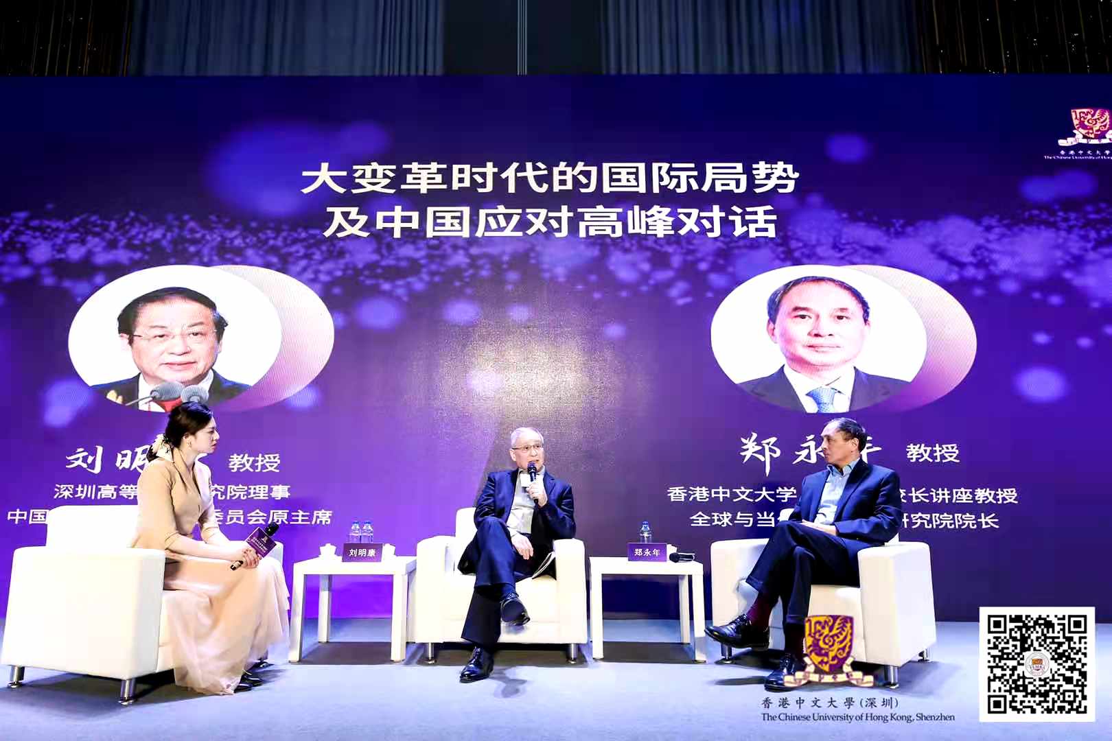 而在隨後舉行的高峰對話中,劉明康教授與港中大(深圳)校長講座教授、全球與當代中國高等研究院院長鄭永年教授就大變革時代的國際局勢及中國應對展開高峰對話。從世界與中國、歷史與現實、機遇與挑戰等多個維度全面深入地探討了國際及國內形勢發展機遇與挑戰。