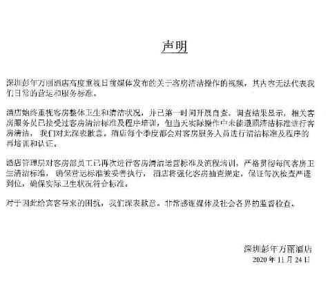 11月24日,深圳彭年萬麗酒店對此作出回應,承認該則視頻確實發生在酒店內,並表示已第一時間開展自查。調查結果顯示,相關客房服務員已接受過客房清潔標準及程序培訓,但當天實際操作中未能遵照清潔標準進行客房清潔。目前,酒店管理層對客房部員工已再次進行客房清潔運營標準及流程培訓,將強化客房抽查規定。對於因此給賓客帶來的困擾,深表歉意。