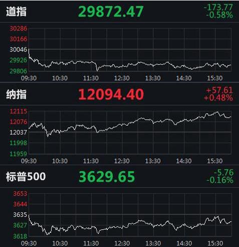 截至收盤,道琼斯工業指數跌173.77點,跌幅0.58%,報29872.47點;納斯達克指數漲57.61點,漲幅0.48%,報12094.40點,創收盤紀錄新高;標普500指數跌5.76點,跌幅0.16%,報3629.65點。