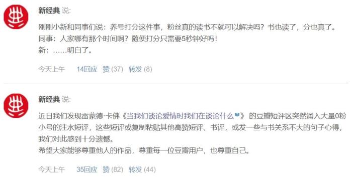 記者注意到,一本名為《當我們談論愛情時我們在談論什麼》 也遇到了相似的情況。出版方在豆瓣頁面中稱,該書「短評區突然湧入大量注水短評,這些短評或複製粘貼其他高贊短評、書評,或發一些與書關係不大的句子心得」。