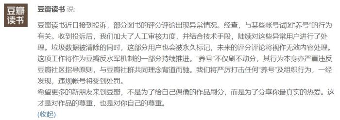 豆瓣讀書官方賬號24日晚就此事回應稱,部分圖書的評分評論出現異常情況,與某些帳號試圖「養號」的行為有關。回應還稱,豆瓣加大了人工審核力度,並結合技術手段,陸續對這些異常用戶進行了處理。