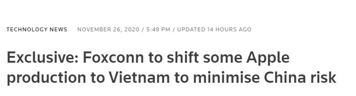 據路透社消息,一位知情人士說,富士康應蘋果公司的要求,將部分iPad和MacBook組件工廠從中國轉移到越南,「最大程度地減少中美貿易戰的影響」。知情人士說,富士康正在越南東北部北江省的工廠建設蘋果iPad平板電腦和MacBook筆記本電腦的裝配線,將於2021年上半年上線。該人士表示,這些生產線將取代中國的部分生產,但沒有詳細說明生產將轉移多少。該人士說:「此舉是蘋果公司要求的,希望實現生產多元化。」