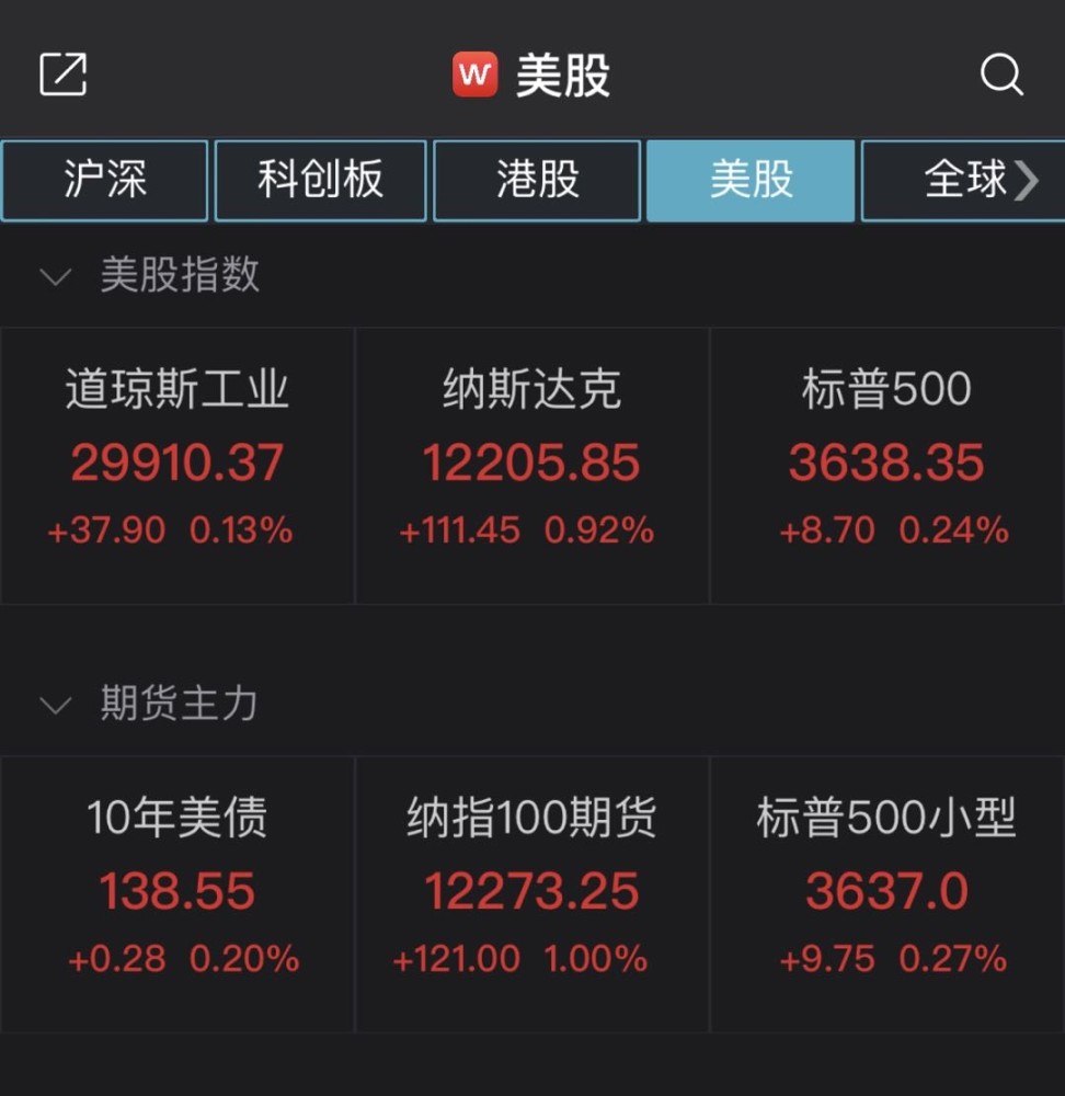 截至收盤,道指漲37.9點,報29910.37點,漲幅為0.13%;納指漲111.45點,報12205.85點,漲幅為0.92%;標普500指數漲8.7點,報3638.35點,漲幅為0.24%。