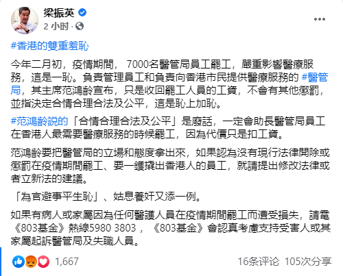 梁振英在帖文最後提醒,若有病人或家屬因為任何醫護人員在疫情期間罷工而遭受損失,可致電《803基金》熱線,基金會認真考慮支持受害人或其家屬起訴醫管局及失職人員。