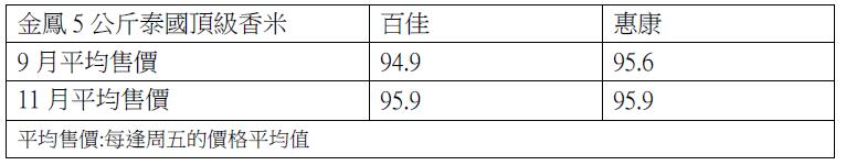 「格價專員」何坤洲解釋為何「超市價格指數」沒有顯著跌幅,他指是由於部分貨品悄悄地加價。何坤洲指關注組監察的21項貨品中,百佳有7項貨品的價格在11月份的平均售價較9月份高;而惠康則有5項貨品出現相同的現象。