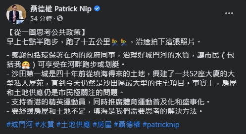 聶德權於帖文中分享了有關公共政策的個人觀感,他指房屋和土地供應仍是市民極關注的問題、要舒緩房屋和土地不足,填海是需要思考的解決方法及支援香港的精英運動員時也要同步推廣體育運動普及化和盛事化。(圖片來源:公務員事務局局長聶德權 Patrick Nip 臉書專頁。)