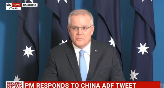 中國外交部發言人趙立堅今天上午在社交媒體推特發文,引用了畫家烏合麒麟的諷刺漫畫,並表示,「對於澳大利亞士兵殘殺阿富汗平民和犯人的行為感到震驚。我們強烈譴責這種行為,並呼籲他們為此事負責。」沒想到,僅2小時後,這幅犀利的作品就令澳大利亞總理莫里森惱羞成怒,親自下場拍視頻對線。