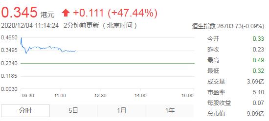 壹傳媒(0282)今早復牌,股價高開41%,開報0.33元,成交額276萬元。其後,股價一度飆100%,高見0.485元,1分鐘成交逾2,000萬元。現價升0.11,漲幅近五成。