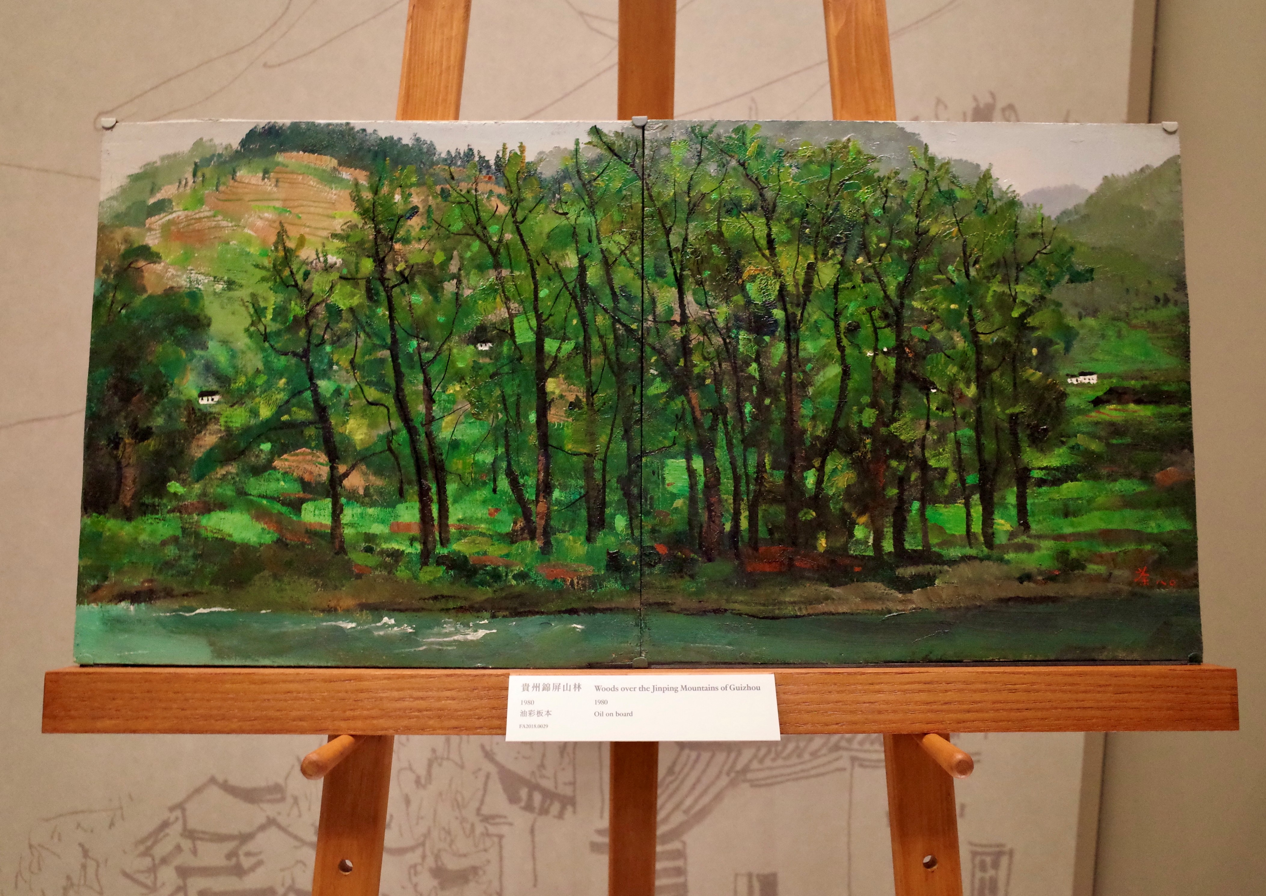 創作過多幅經典畫作的吳冠中曾說:「我體會形式美感都來源於生活。我年年走江湖,眾裏尋她千百度,尋找的就是形式美感… …」香港藝術館館長(至樂樓)鄧慶燊向記者表示,吳冠中每一刻都拿著寫生用具,當見到美麗的事物便可立即捕捉,對他來說速寫很重要。他曾經為了寫生,而錯過了一班火車,卻創作了《寧波水鄉》,從《寧波水鄉》進而孕育香港藝術館的鎮館之寶《雙燕》。吳冠中無時無刻都要捕捉生活所見之美,與時下人們的平時「打卡」不是有些相似嗎?只不過現代人以手機、相機捕捉,吳冠中所用的工具則豐富得多,「除了常用的鋼筆及其他硬筆的工具外,他亦會直接用油畫的方式即場寫生。」據鄧館長介紹,展品《貴州錦屏山林》正是吳冠中即場寫生的油畫作品。在該幅描繪了貴州鄉村山林的畫中,畫家大膽地運用了點、線、面手法,以不同層次的綠色繪畫樹葉,顯得這座山林寧靜而閒逸。館方更特意將作品放置畫架上,營造出寫生的情景。