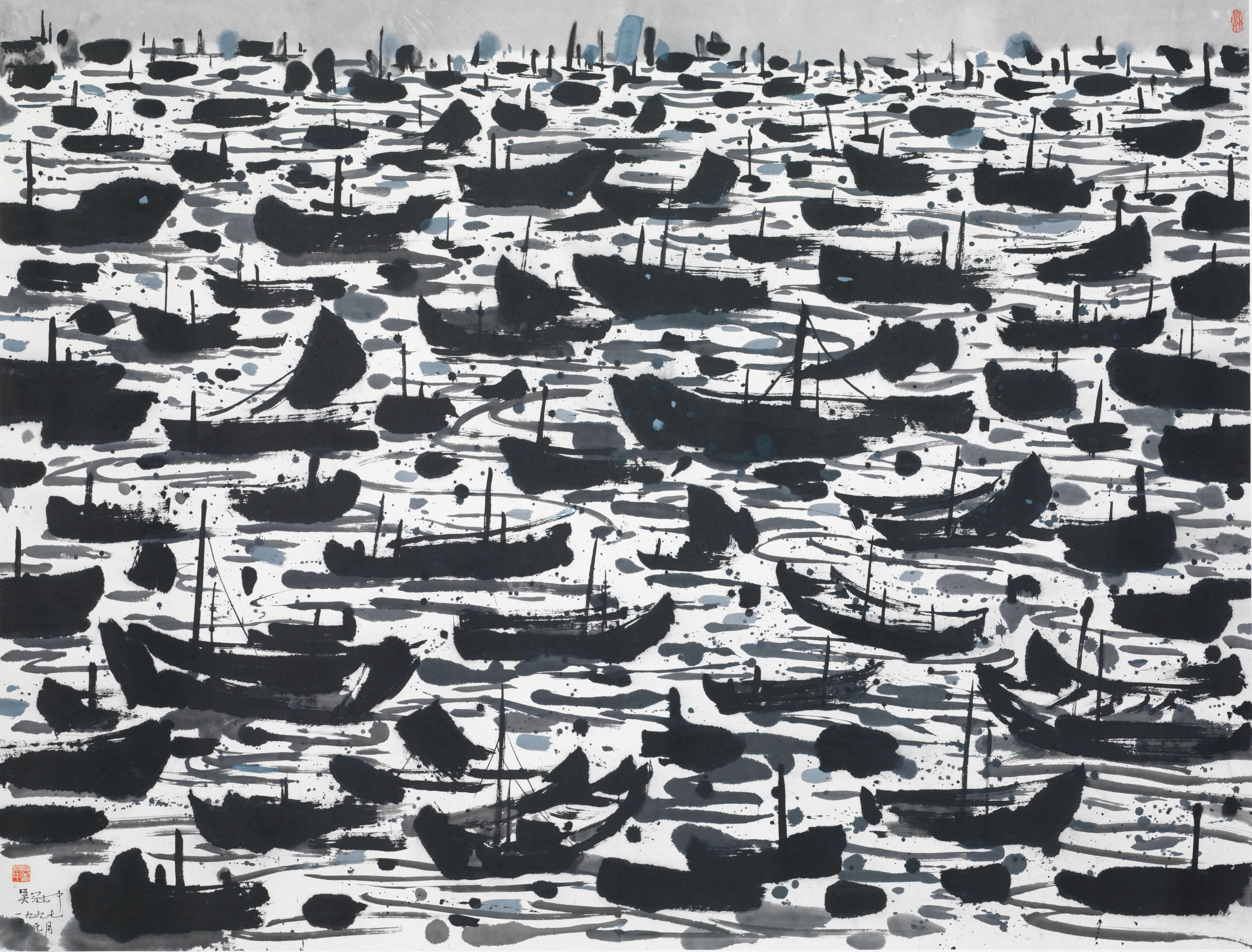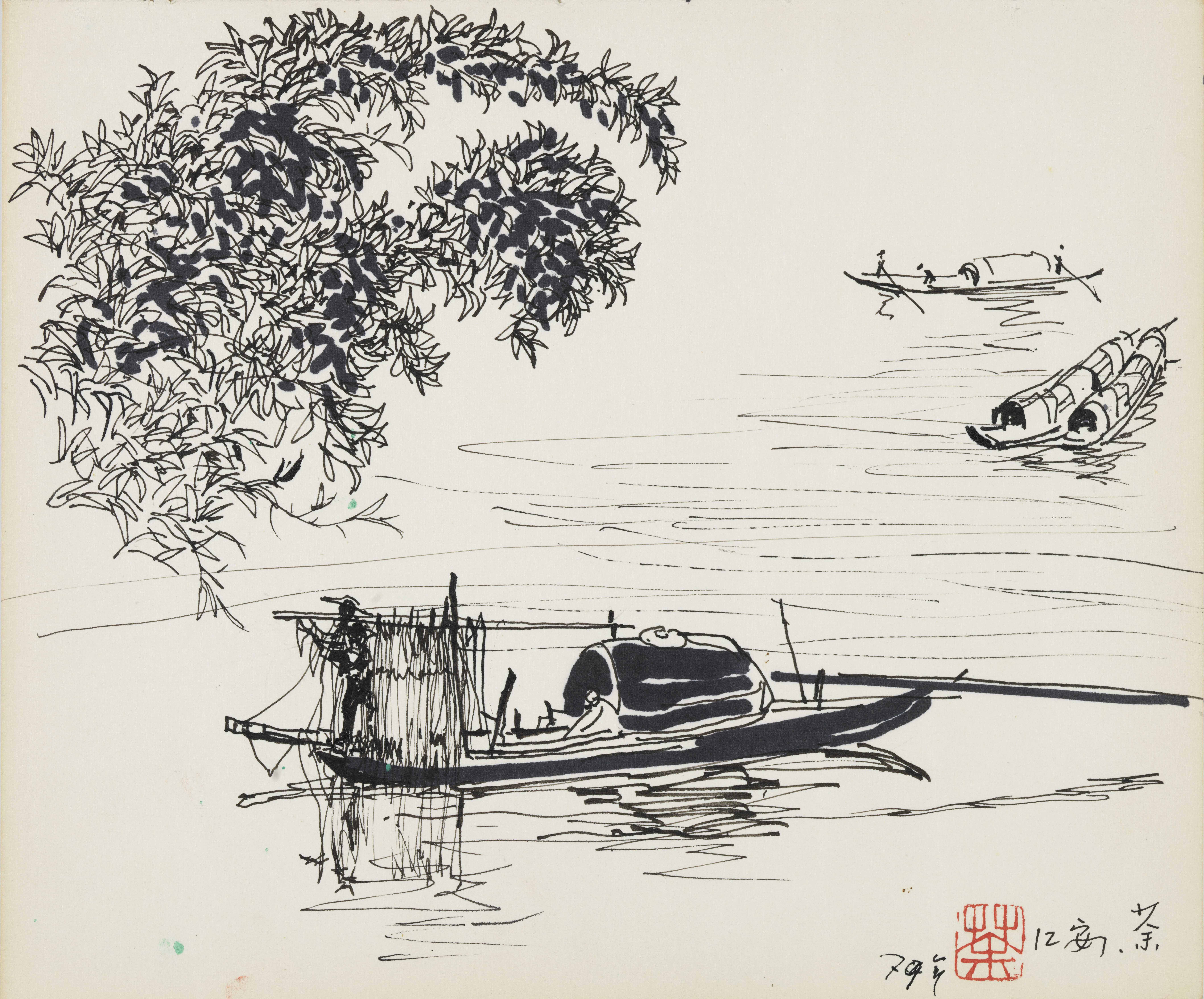 將「打卡照」發布到社交平台前,不少人會修圖、加濾鏡,「左執右執」,為了令成品更有美感。吳冠中也不例外,從速寫到畫作的完成品橫跨數年、甚至數十年的時間。展品《石塘》和《漁港》,前者繪於1982年,後者繪於1997年。相隔十餘年,畫家作了藝術的提煉,為呈現自己於溫州繪畫《石塘》時遇上風暴、漁船紛紛駛進港內避風的情景,他將船隻用更厚重的筆觸勾勒,加上畫中水面的線條,讓觀者通過《漁港》感受風雨欲來的現場感。