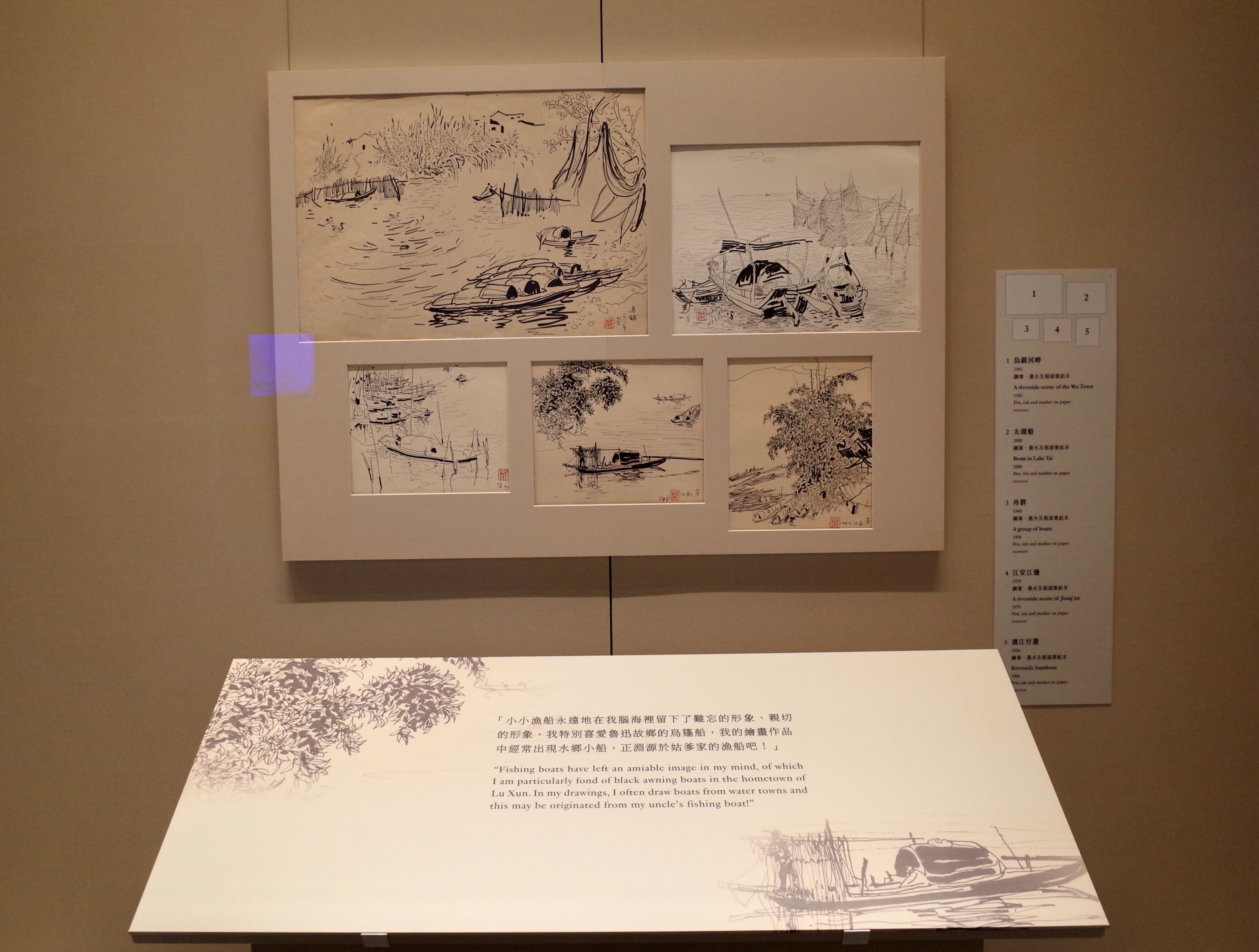 吳冠中繪畫的多幅烏篷船作品,展品下是吳冠中曾經說過寫過的,與畫作相關的話語。