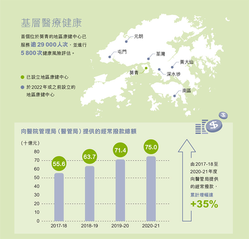 同時,就十一區屬過渡性質的「地區康健站」徵求建議書,並正就建議書進行評審,以期於2021年開始營運「地區康健站」的服務已完成。屆時,全港十八區均會有不同規模的基層醫療健康服務,為長遠建立一個以預防為中心的基層醫療體系打好基礎。