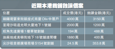 當前商舖蝕讓放售的個案仍然不時出現,最近油麻地咸美頓街雙號地下舖位便蝕讓放售,該地舖面積約600平方呎,自建閣樓面積約500平方呎,近期以1880萬元放盤,但該業主於2017年初以2280萬元買入該舖,現時放盤出售帳面低400萬元或約17.5%,估計買家都會進一步壓價,最終成交價肯定會更低。