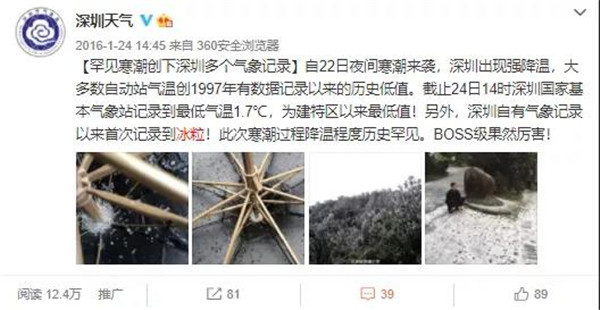 還記得2016年那場「Boss級」寒潮嗎?2016年1月24日,「Boss級」寒潮橫掃我國,深圳下起了冰粒,雖然不是六瓣雪花兒,但也屬於雪的一種。這是有氣象紀錄以來唯一僅有的一次降雪了。