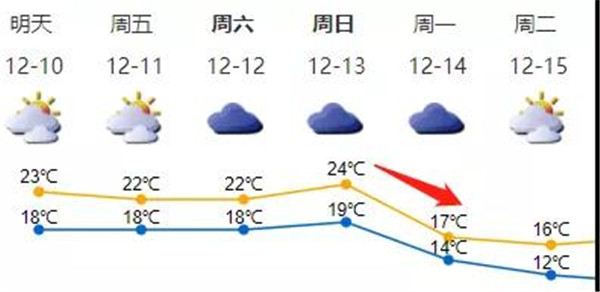 受偏東氣流影響,未來幾天雲量增多,偶有零星小雨,濕度上升,從14日起,受新一股冷空氣影響,氣溫又會有進一步下降。