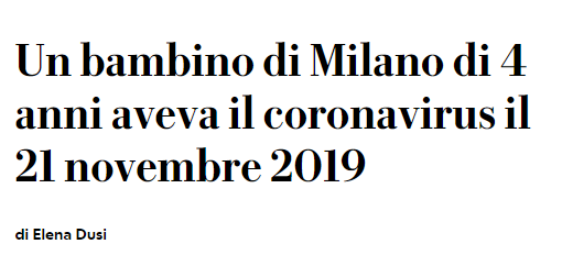 據意大利《共和國報》12月9日報道,米蘭大學研究人員在一份2019年12月初提取的一名4歲兒童咽部分泌物中發現新冠病毒,並由此推論2019年11月中旬新冠病毒已在意大利傳播。