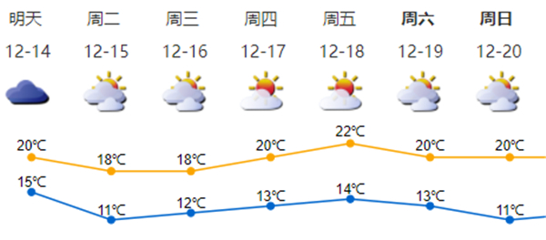 周二至周三(15-16日)早晨最低氣溫降至11℃左右,白天可見陽光;