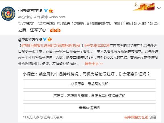 據公安部新聞中心,公安部治安管理局官方微博消息,近日,有媒體報道稱,廣東東莞一網約車司機艾先生近日接到一張訂單,乘客為一家三口帶著一個嬰兒,上車不久嬰兒突發疾病失去知覺。艾先生連闖三個紅燈將孩子送醫,為此,他要面臨被扣18分,並處以600元的罰款。交警表示需提供相關的醫院證明,但嬰兒家屬卻拒絕作證,稱闖紅燈跟他沒關係。隨後,警方表示會通過監控視頻和醫院的紀錄來證實艾先生所說。