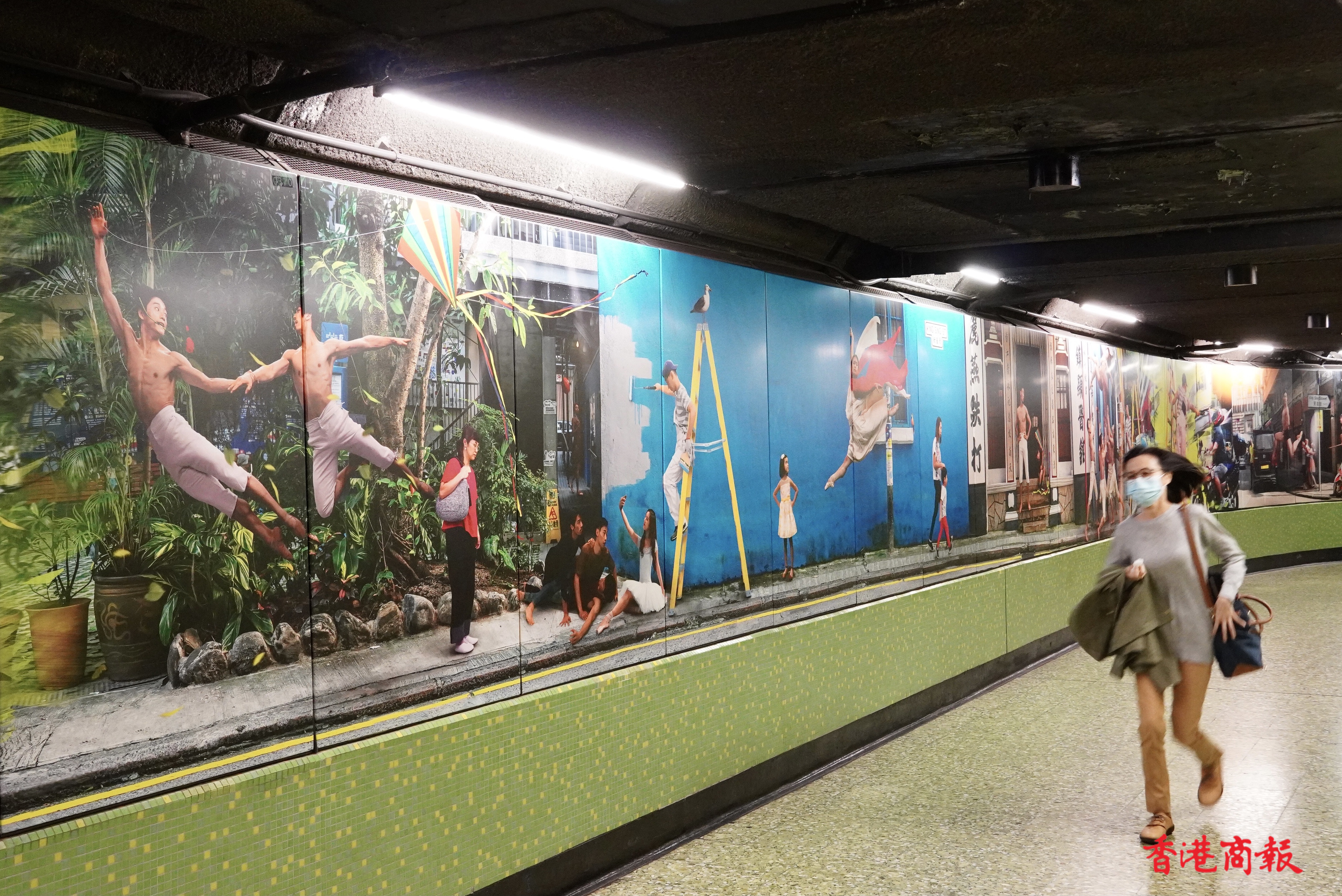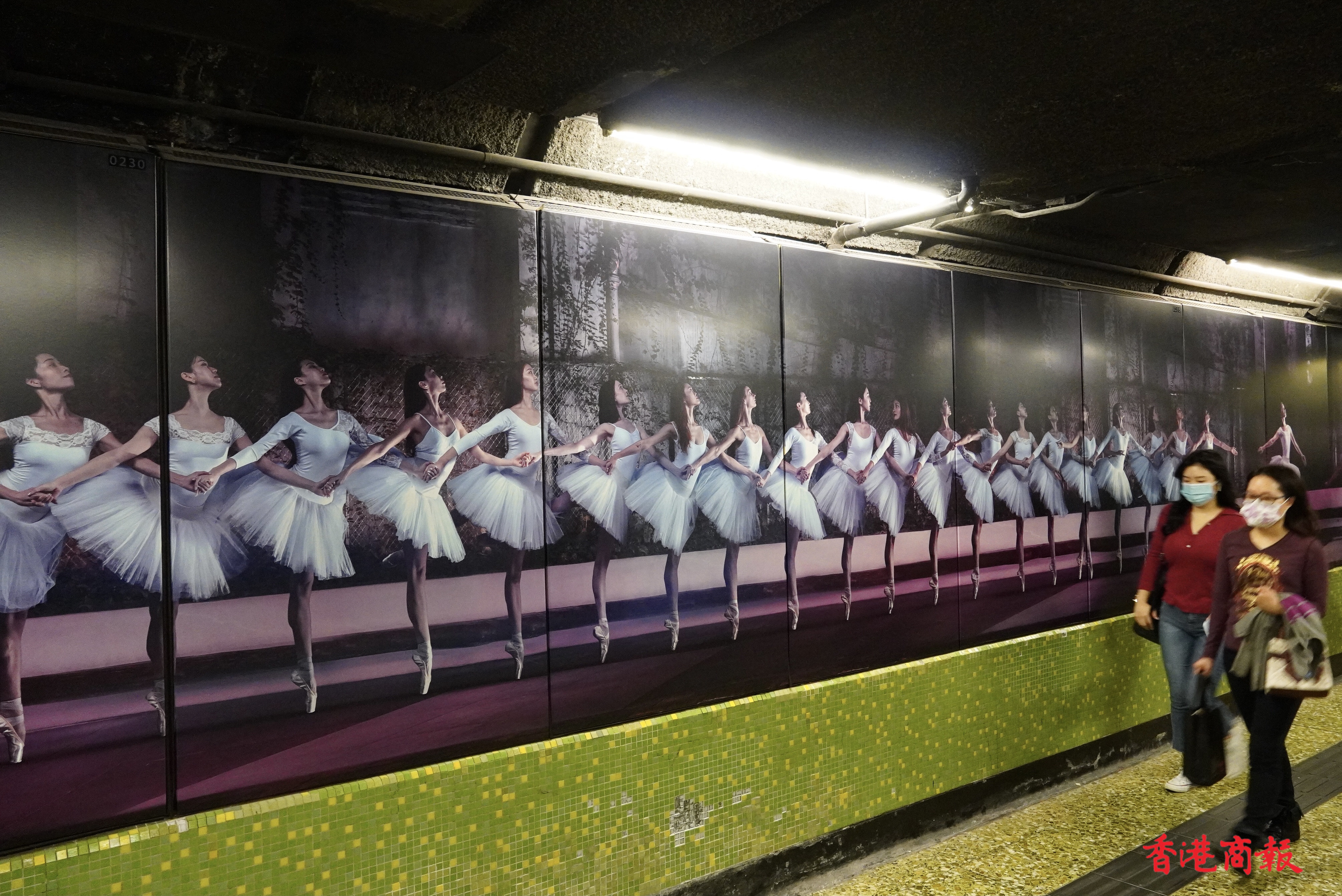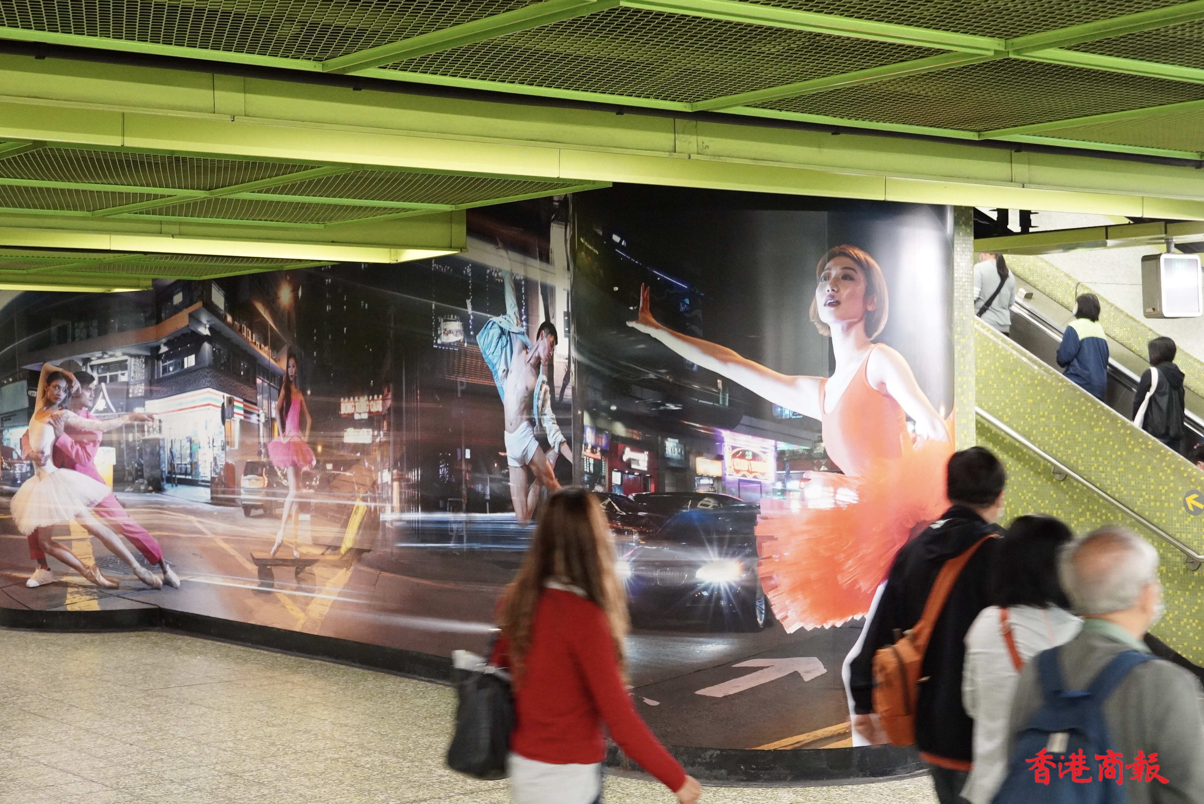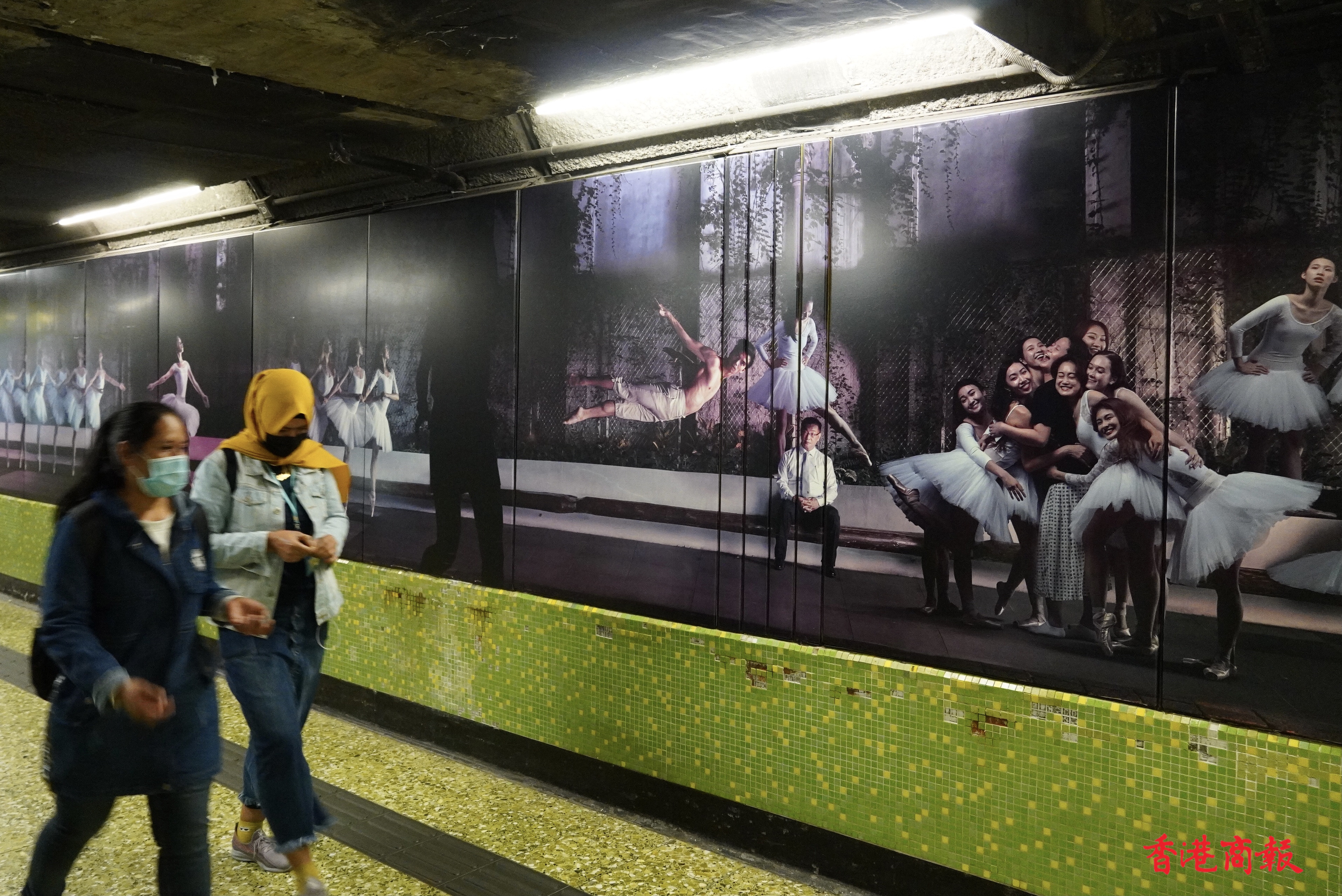 繁忙的港鐵灣仔站,牆壁上出現了約長一百五十米「這是灣仔」的大型攝影藝術裝置。作品由多媒體藝術家Jevan Chowdhury構思,共有40多名舞蹈員及巿民參與其中。鏡頭捕捉了香港芭蕾舞團的舞蹈員,在灣仔不同街道和行人的互動的舞姿。作品通過現實與想像交融的鏡頭,紀錄「人生如戲,戲如人生」的日常生活面貌。港鐵灣仔站彷如化身為生動的表演舞台,讓乘客途經時可以樂在其中,感受藝術氣氛。(馮俊文 攝)